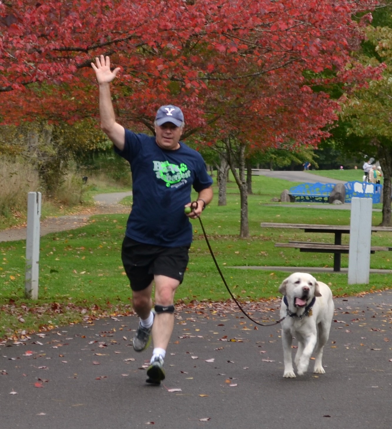 Finally, the mayor blew the air horn that started the race. Dad and Mr. M started behind all the competitors who were unlucky enough to not have a dog with them. Within the first half a mile, Mr. M had dragged Dad to the front of the pack, when Mr. M abruptly pulled over to the side for a poop break. Dad quickly bagged it and then they rejoined the race. Within the next half mile, they were again at the front of the pack.