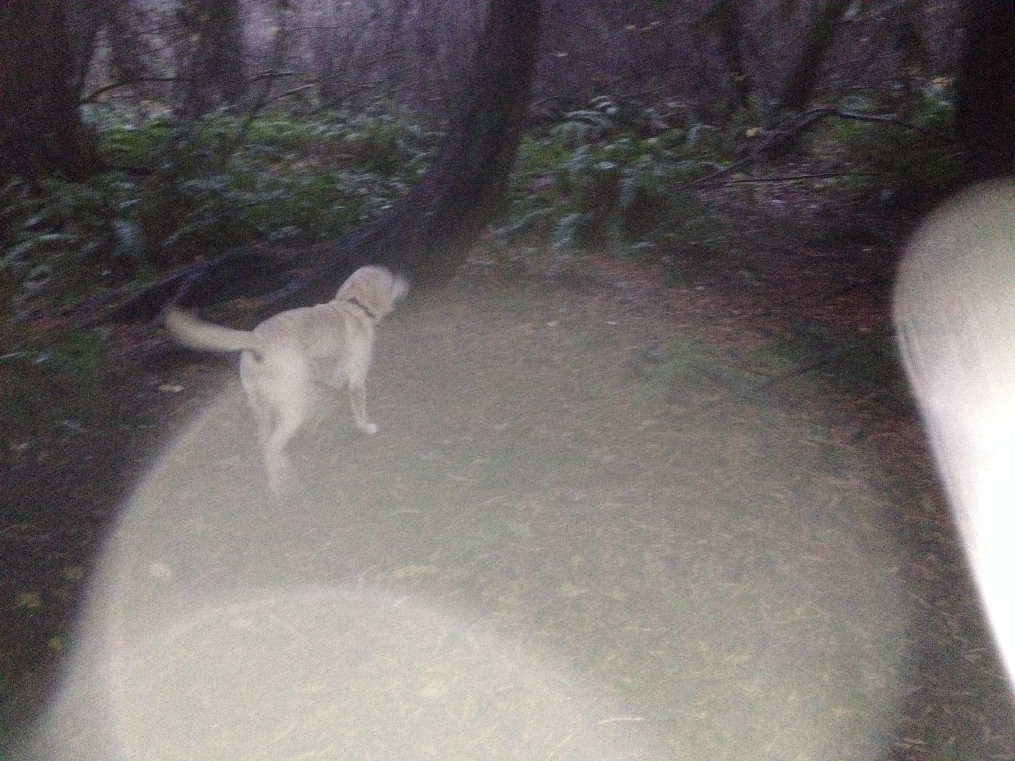 Dad finished his shopping and then he and Mongo went to the big park. It was almost dark, but both neither of them were concerned with the ambient light. After a fun walk in the cold rainy dark, they headed back home.