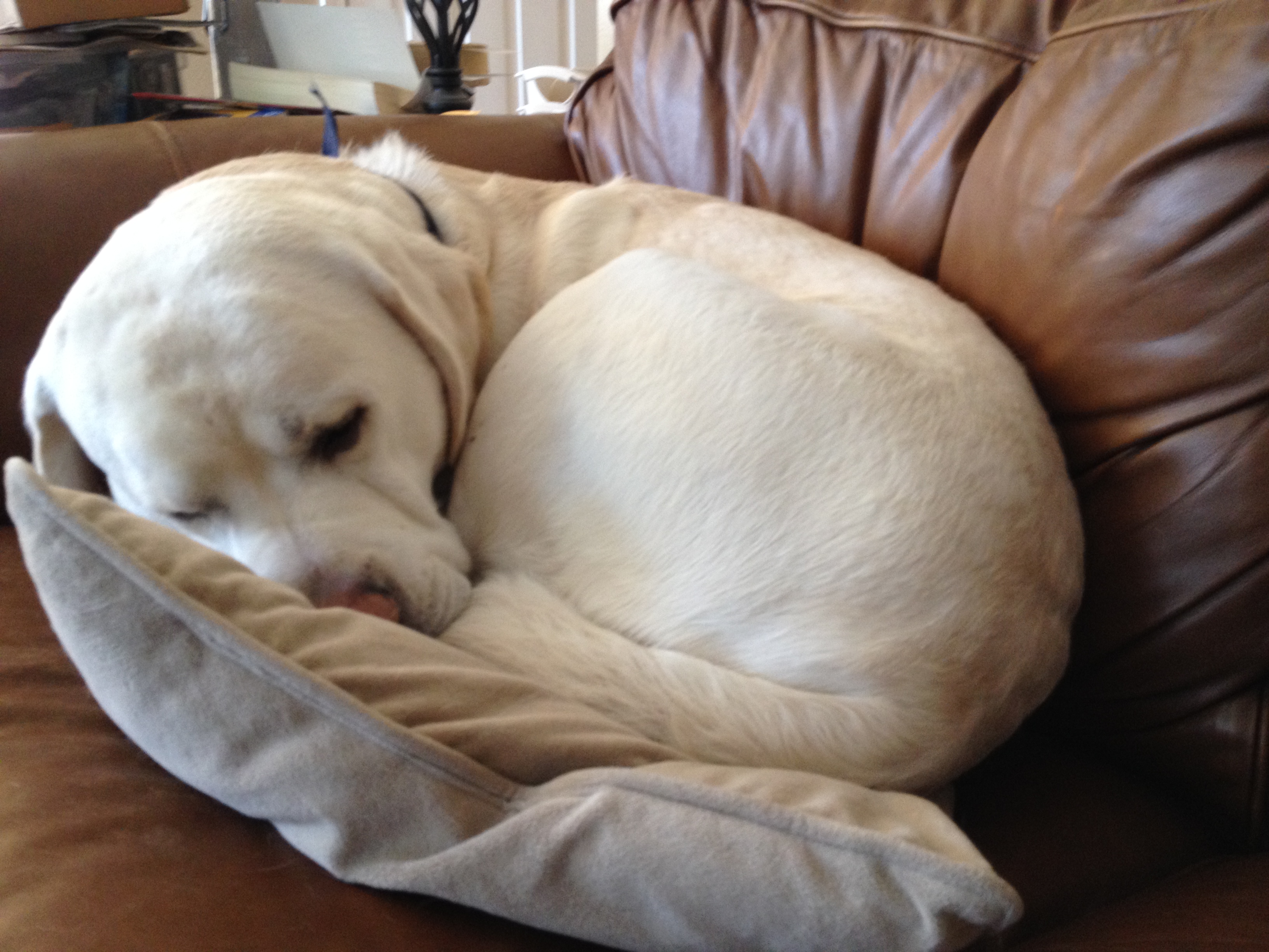 Afterwards, they went home, and Mongo curled up on the couch like a wee bitty 90 lb. puppy.