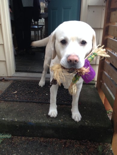 There are studies that say that dogs can develop reasoning powers on a par with a human toddler. And retrievers, i.e. Mongo, are near the head of the class. Animal psychologists say dogs like Mongo can understand up to 250 words and gestures. Mongo knows quite a few words, and some of his favorites are: FOOD, NOM, EAT, PUPPY, PAPER, and PARK. He has learned fairly complex behaviors such as getting the paper, finding and retrieving birds, and bringing Kimi’s slippers outside.