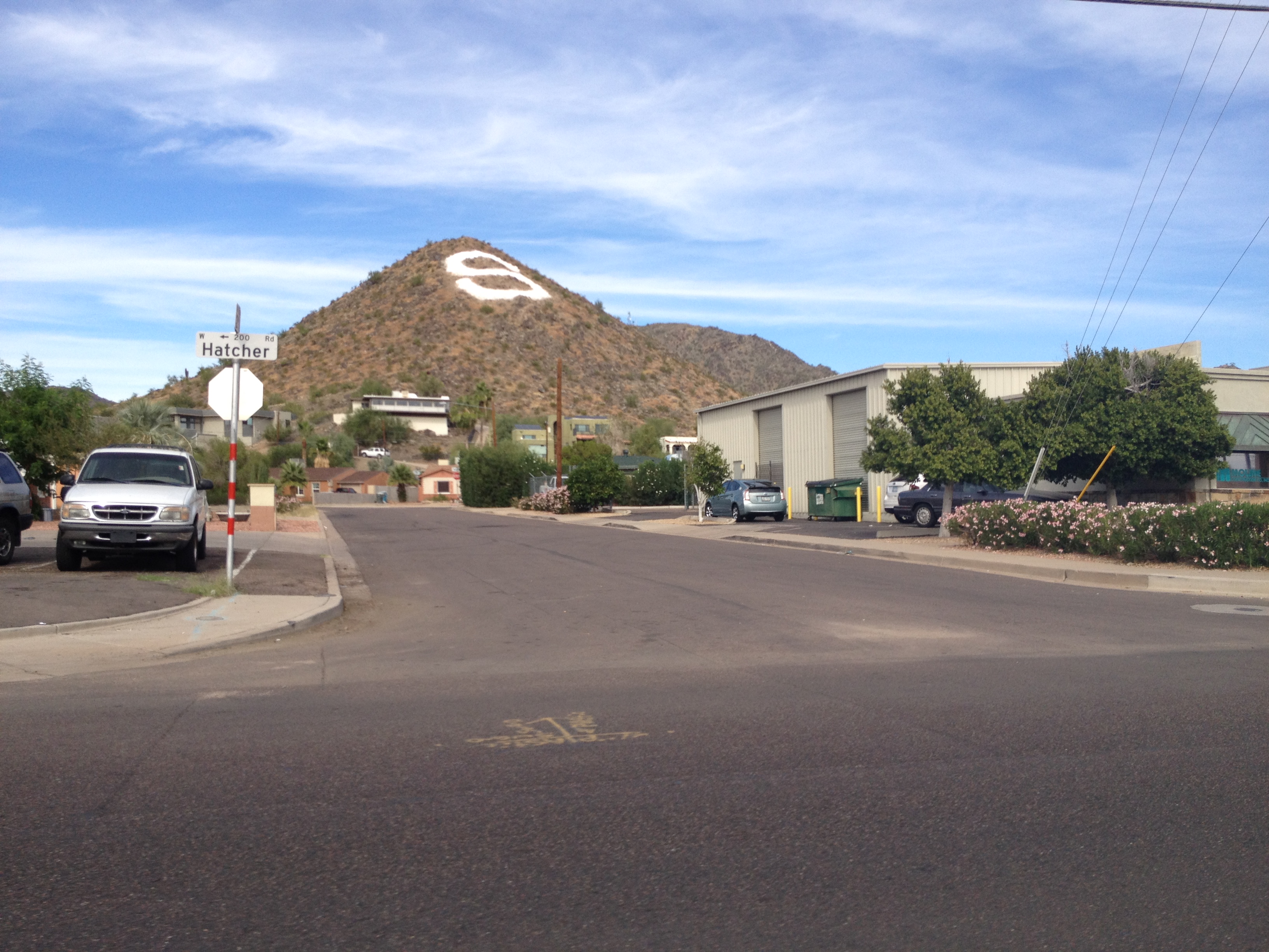 Dad arrived at Sunnyslope School at about 5 o’clock, and the “S” was practically right across the street. It had taken him about 30 minutes, so that meant he had gone about 3 miles. His guess at the distance to the mountains had not been too far off. He stood beside a busy street, but traffic wasn’t too bad, and Dad figured he could cross easily if he moved quickly enough if he wanted to. He paused on the sidewalk for a moment to decide if he wanted to cross.