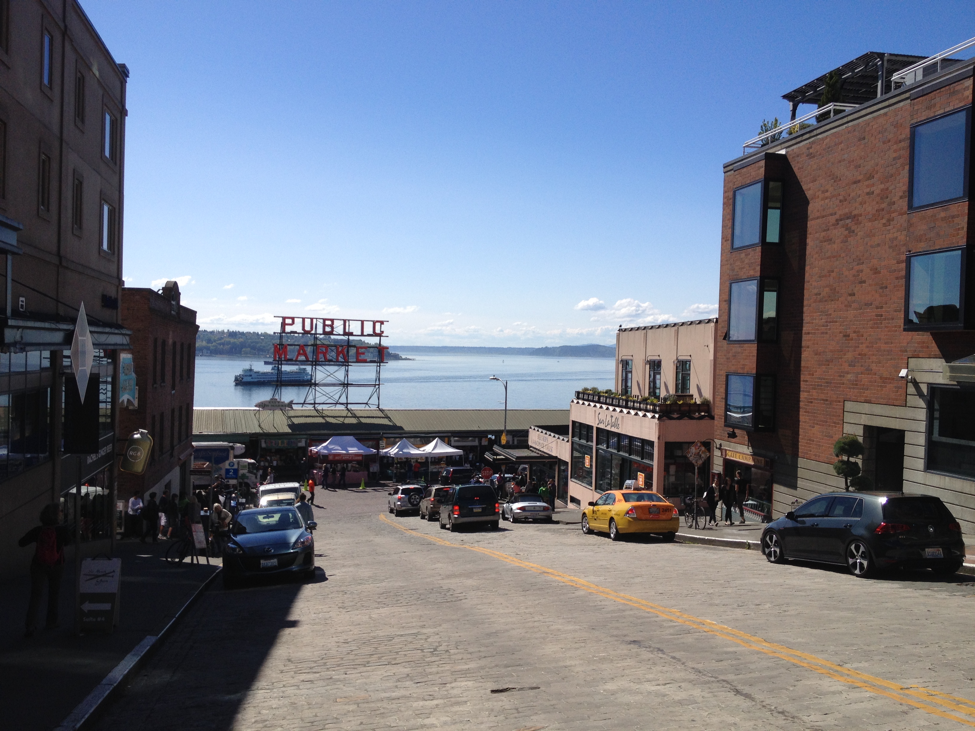 Dad took a leisurely stroll back to the truck in the sun, so as to be sure to finish his gelato before having to climb behind the wheel. He returned to the truck via Pike’s Market again. A ferry cruised by out in the bay.
