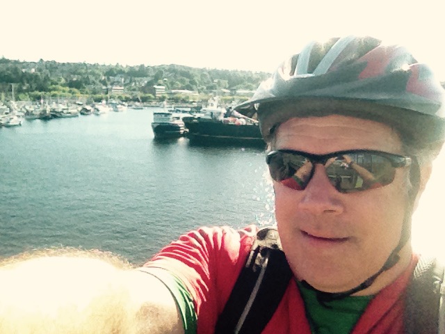 Dad tucked in behind a more seasoned cyclist and followed him through the chaos, till they reached King St, and the Elliot Bay trail. Once on the trail, Dad was finally able to relax. He let his shoulders unwind a bit, and started to breathe again. By the time he was on the approach to the West Seattle bridge, he was feeling so good, he raced up to a giant buckled slab of sidewalk and using it as a ramp, jumped his bicycle into the air a’la Evel Knievel. As Dad bounced to a successful landing on the sidewalk, he realized that jumping his 40-year old ten-speed was probably a bad plan; so many things could have gone wrong, flat tires, broken bones, etc. Or even worse, he could end up walking a broken bike all the way home along the sidewalk while wearing spandex shorts and a goofy looking helmet. But he also decided it was a lot of fun anyways.