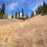 Dad followed the path around and started another steep climb up into another alpine meadow.  This one interestingly enough had a small tree frog hopping along the trail.  Who knew there were tree frogs above 5000 feet?  Once again Dad reached the end of civilization and entered into the unmaintained wilderness.
