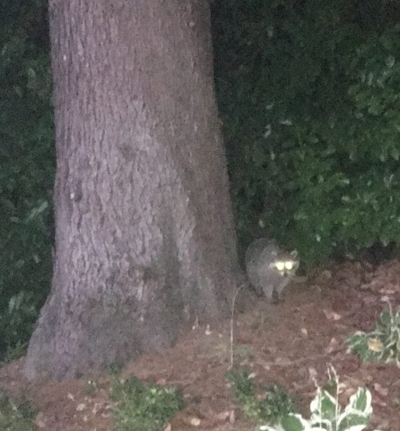 At the sound of Dad’s voice, the raccoon climbed back down the tree and stood at its base, looking at Dad.