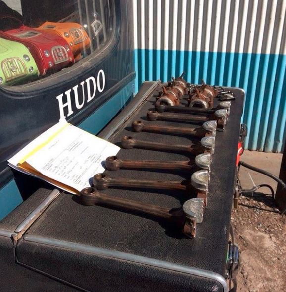 Hudo is back in the garage, getting another major repair. Heidi has had to order a new set of pistons and connecting rods.